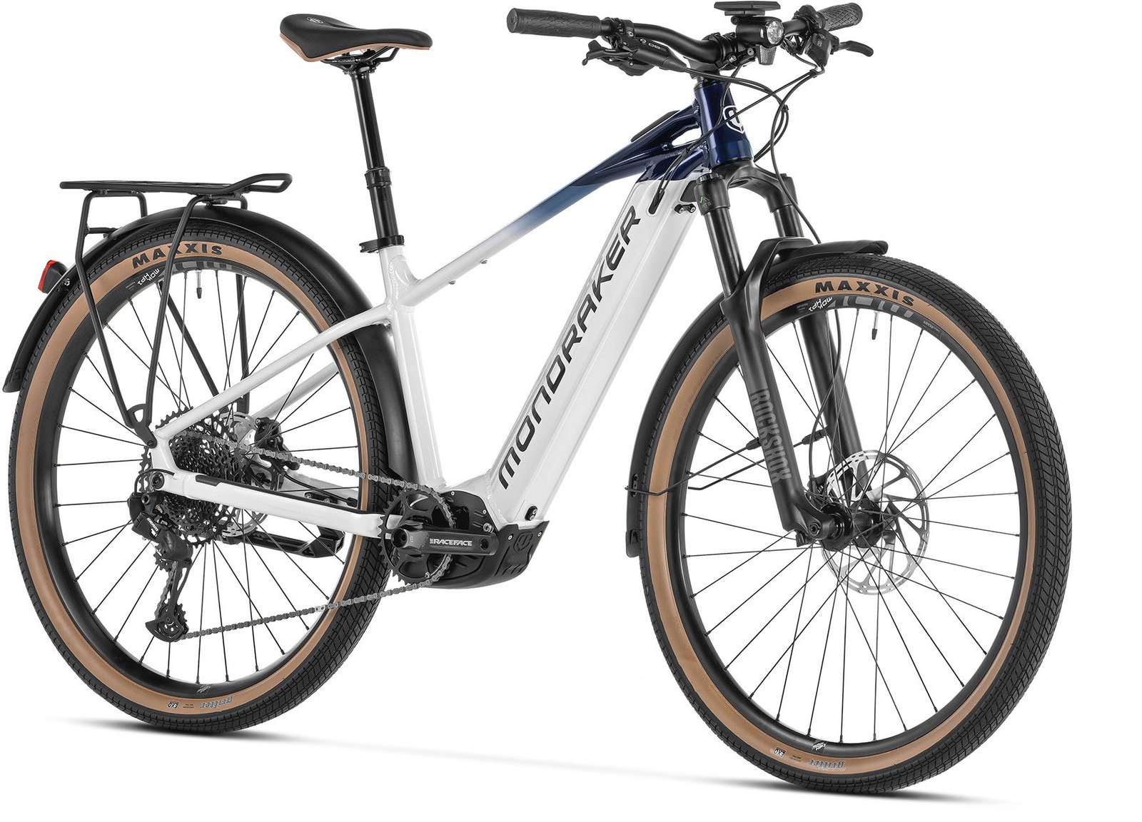 The Mondraker Prime R X is the perfect choice for someone looking for a versatile bike to give them the widest range of options possible. On the one hand it comes as standard with mudguards, a pannier rack and lights to move comfortably around the city, yet it’s also a fully-fledged off road bike offering you access to the trails and bridleways when you feel like it. The range offered by its big 750Wh battery coupled with its bang up-to-date motor, Bosch’s 2023 Smart System, is complimented by the wireless Mini Remote and integrated System Controller to let you ride for hours and hours wherever you fancy. Thanks to the SRAM Eagle 1×12-speed drive, you’ll always find the right gear uphill as well as downhill. Disconnect from the daily grind and enjoy getting out on your bike, whether on-road or off.