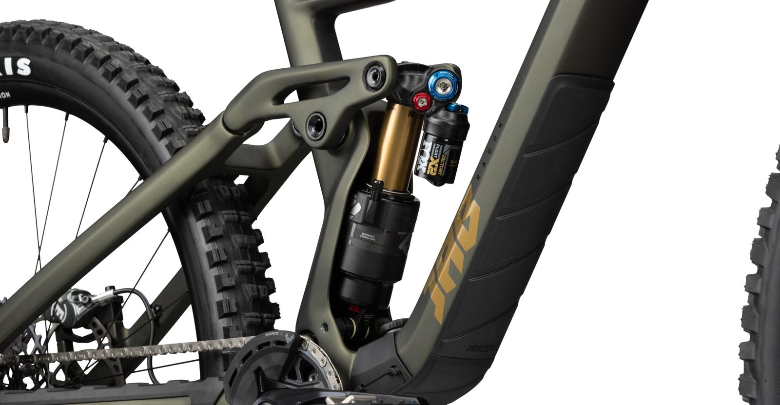 With 170 mm of travel, the Fox 38 Factory with FIT GRIP2 cartridge and elegant Kashima coating is not only visually impressive – you also get the flagship from Fox in terms of technology. With the finely adjustable GRIP 2 cartridge, you can set the HSC (High-Speed Compression) and LSC (Low-Speed Compression) separately and, in conjunction with the optically integrated Fox Float X2 Factory, optimize the suspension for any terrain. With the Newmen Evolution SL A.30 wheelset, you get the favorite of our test riders: a quiet FADE hub, 30 mm rim width and a modern rim profile offer you the perfect basis for the tires. Here we rely on Maxxis Assegai and Minion DHR II with soft 3C MaxxTerra rubber compound and EXO+ carcass for optimum grip on your favorite trail. The drivetrain couldn’t be more modern: With the brand-new SRAM Eagle Transmission with parts from the GX and X01 series, you not only have a super-clean cockpit thanks to the wireless AXS POD controller – the crisp gear changes will also win you over in no time. With so many downhill-heavy parts, a proper braking system must also be on board: This is where the flagship Magura MT7 with four pistons at the front and rear does its job. Targeted braking before the next turn, emergency braking at key points or easily controlled braking actions – all no problem for one of the most powerful brakes on the market. With so many highlights, it’s easy to overlook the fact that the visually matching Fox Transfer Dropper is also included as standard and that your future cockpit will be made up of high-quality Race Face Turbine R parts. The JAB MX 10.0 HD – a dream come true!